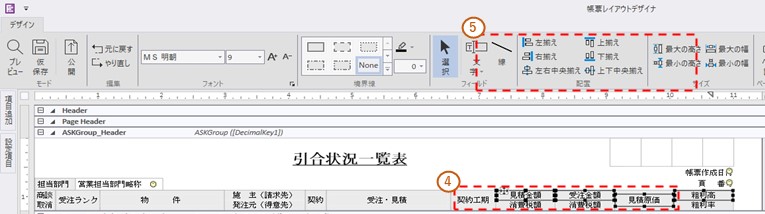 5.「デザイン」タブ内の「配置」グループと「サイズ」グループのボタンを選択して配置を揃えます。