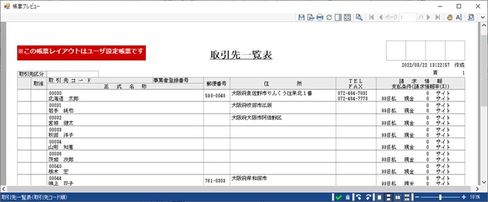 例)〔取引先一覧表〕で帳票レイアウトの調整が行われた場合