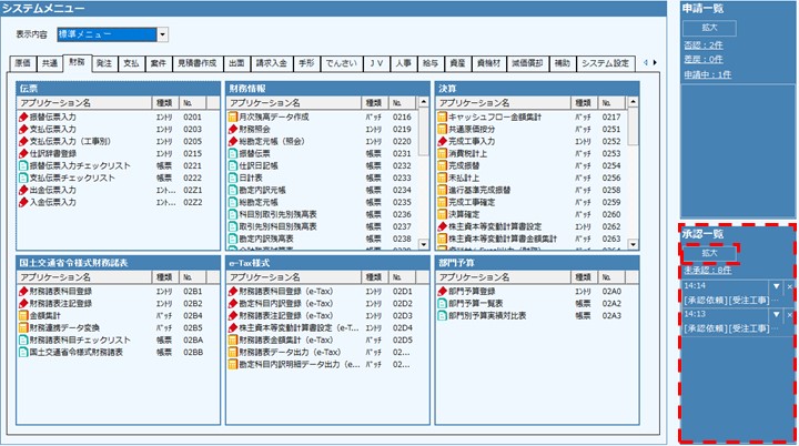 システムメニュー画面右の承認一覧の「拡大」ボタンで承認一覧をメニュー表示します。