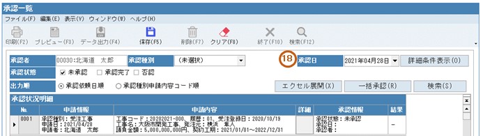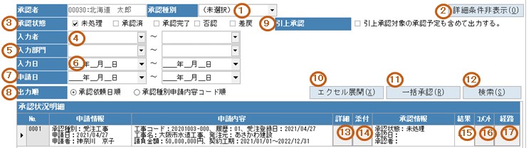 12.条件に応じた検索を実施し、結果を「承認状況明細」に表示します。