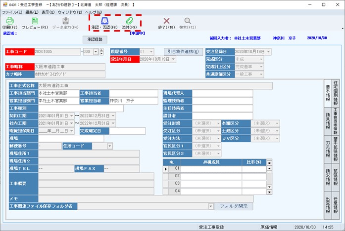 システムメニュー画面右の承認一覧の通知メッセージをクリックすると、入力時の画面を起動します。