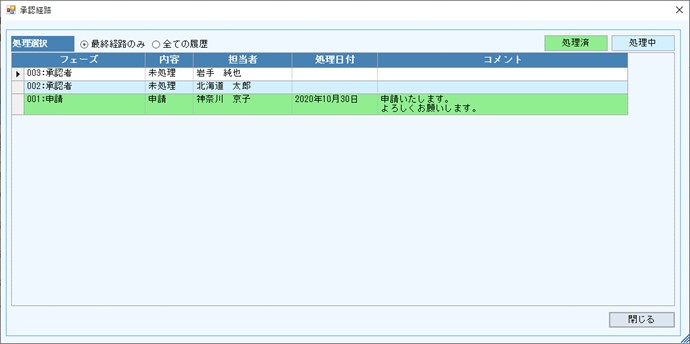 申請時、または承認時にコメントが入力されている場合、「経路」ボタンに「■」が表示されます。