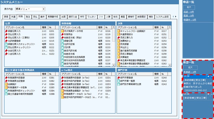 システムメニュー画面右に承認一覧が表示されていない場合は、メニューバーから承認一覧を